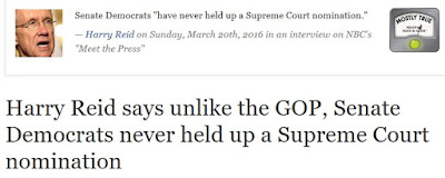 Reid's answer to Todd was complete baloney, in context. PolitiFact's fact-check does nothing to emphasize that context to its readers. Instead, PolitiFact readers get a misleading headline sending the message that Democrats hardly at all obstruct the Supreme Court nominations of Republicans.